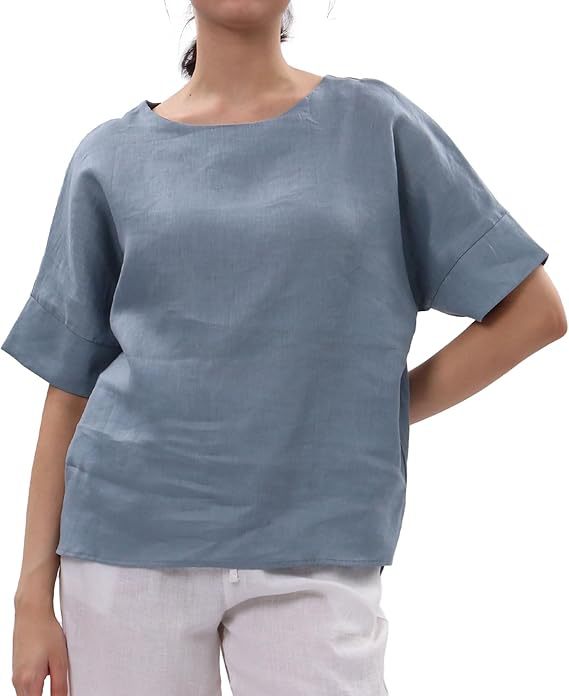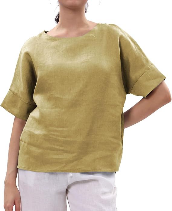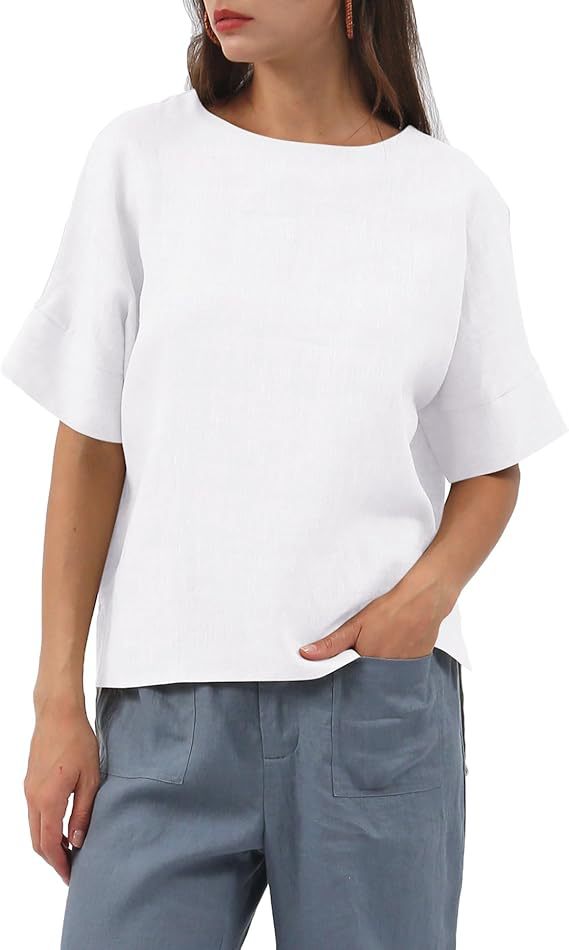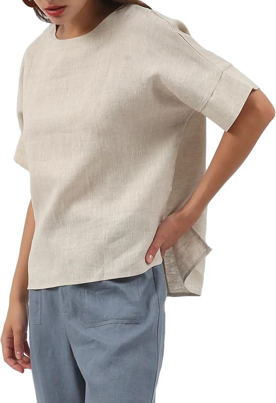 Linen Top Crew-neck Short-sleeve Shirt